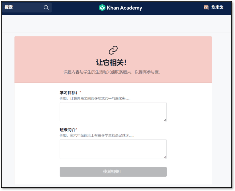 在其最新版本的人工智能助手Khanmigo的界面中,专门出现了一个功能:「让它相关」(Make it Relevant!)