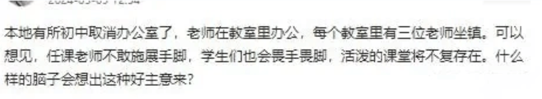 对于我的说法,或许有人感到不可相信,但是看看下面的帖子,你就相信了:本地有所初中取消办公室了,老师在教室里办公,每个教室里有三位老师坐镇。可以想见,任课教师不敢施展手脚,学生们也会畏手畏脚,活泼的课堂将不复存在,什么样的脑子会想出这种好主意来?