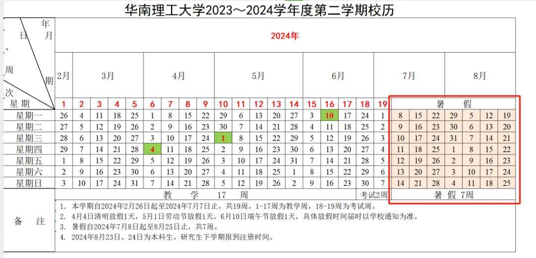④华南理工大学:暑假自2024年7月8日起至8月25日止,共7周。