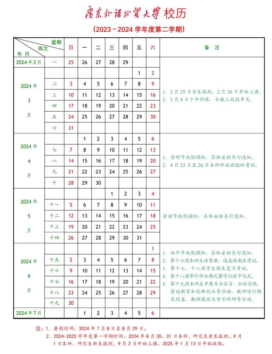 ②广东外语外贸大学:从广外2023-2024校历可知,广外暑假时间为2024年7月8日至8月29日。