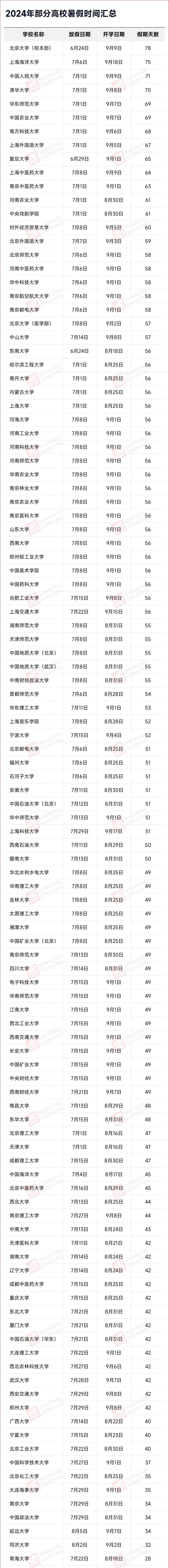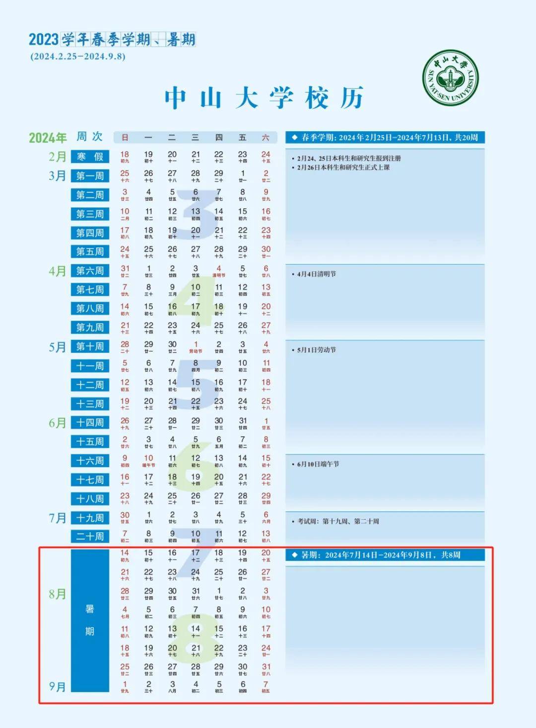 ①中山大学:据中山大学校历,暑期时间为:2024年7月14日-2024年9月8日,共8周,长达56天!