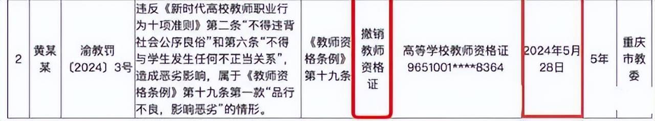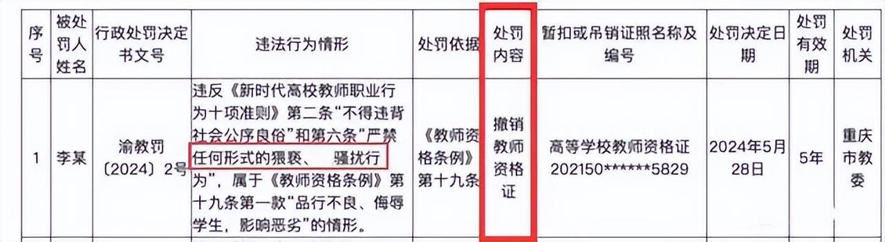 这是近日重庆市教委官方网站发布的一个通告“2024年行政处罚公开信息(2)”里的两个不配为人师的家伙:李某某和黄某某。重庆教育局给予他们的行政处罚是:撤销了他们的高等学校教师资格证,撤销有效期为5年。