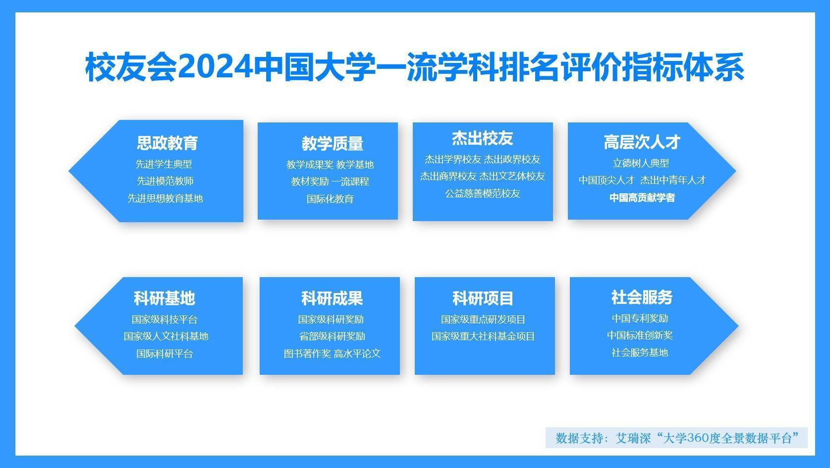 校友会中国大学一流学科排名首发于2014年,旨在给2024年全国高考和考研考生填报志愿、中国大学“双一流”建设提供权威参考。校友会中国大学一流学科排名评价体系由思政教育、教学质量、杰出校友、高层次人才、科研平台、科研成果、科研项目与社会服务等八大一级指标组成,以艾瑞深“大学360度全景数据平台”为数据支持,围绕着“大平台、大团队、大项目、大成果、大校友”对中国大学学科发展水平展开评价,涵盖200多项体现中国大学学科建设水平的核心评价指标。