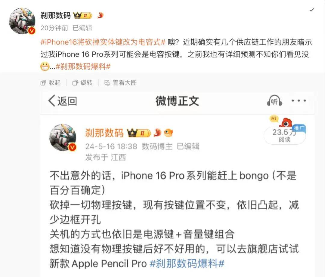 据数码博主最新爆料,供应链内部人士暗示苹果即将推出的iPhone 16系列将进行一项革命性的设计更新——取消所有实体按键,全面采用电容式触控按键。