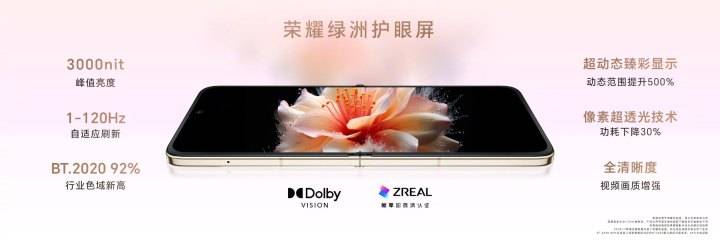 不光外屏素质出色,荣耀Magic V Flip的内屏也堪称旗舰级,内屏尺寸达到6.8英寸,分辨率2520x1080,像素密度403PPI,为影音娱乐、移动办公提供超大视野,采用了行业领先的荣耀绿洲护眼屏,带来零风险级别的全天护眼体验。同时,屏幕素质同样与直板旗舰机看齐,展开后 旗舰素质的6.8英寸超清大屏,在显示增强技术的加持下,配合立体声双扬声器,带来超清震撼的娱乐视听体验。