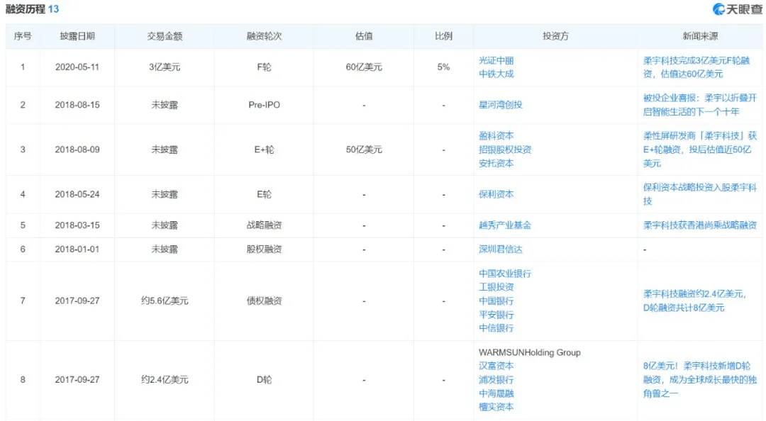 柔宇科技曾凭借柔性屏与柔性屏手机引来市场瞩目与投资热潮,在资本的追逐下,其迅速完成从A至F轮累计13轮融资。