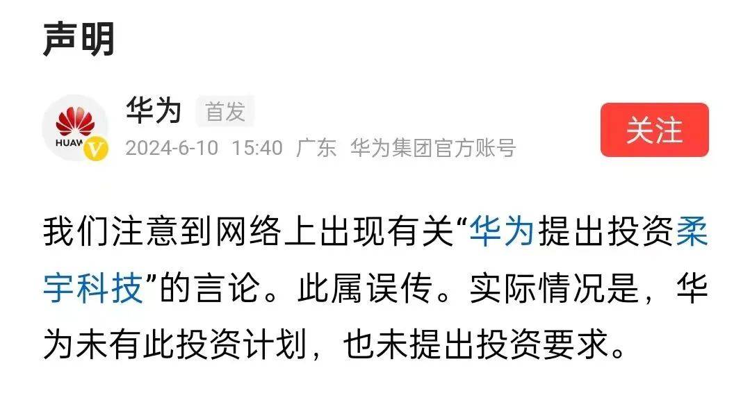 6月10日下午,华为集团官方账号发布辟谣声明称:我们注意到网络上出现有关“华为提出投资柔宇科技”的言论。此属误传。实际情况是,华为未有此投资计划,也未提出投资要求。