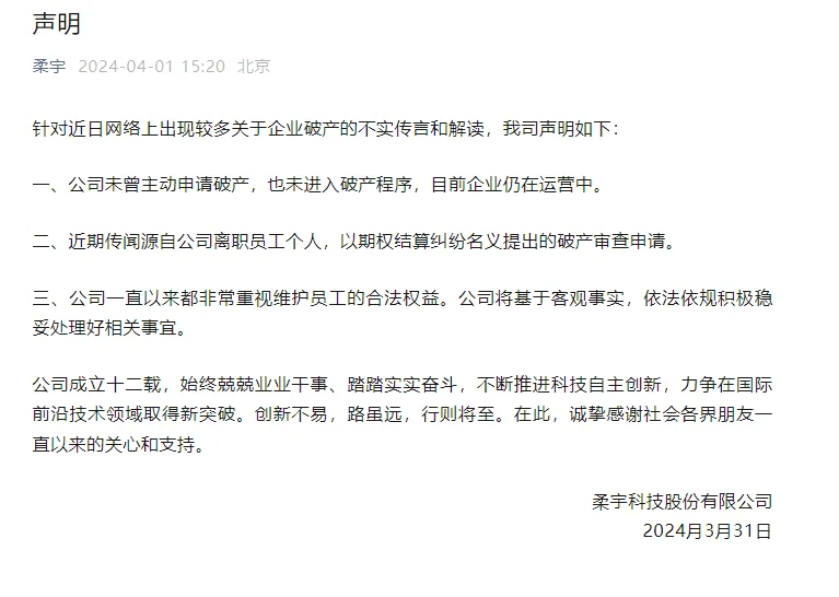 而在今年4月1日,柔宇科技微信公众号发布声明称,针对近日网络上出现较多关于企业破产的不实传言和解读,柔宇科技表示,公司未曾主动申请破产,也未进入破产程序,目前企业仍在运营中。近期的传闻源自公司离职员工个人,以期权结算纠纷名义提出的破产审查申请。公司一直以来都非常重视维护员工的合法权益,公司将基于客观事实,依法依规积极稳妥处理好相关事宜。