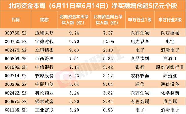 从周度(6月11日至14日)表现看,北向资金周净买额累计超5亿元的个股见下表。具体来看,迈瑞医疗、宁德时代、立讯精密净买入额分别为9.74亿元、9.7亿元、9.43亿元;山西汾酒、中信银行加仓额均超7亿元。