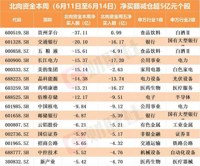 从卖出方面看,本周北向资金净卖出超5亿元的个股达15只(见下表)。具体来看,贵州茅台净卖出额为37.11亿元,交通银行减仓额为20.1亿元,五粮液、长江电力、美的集团减仓额均超15亿元。