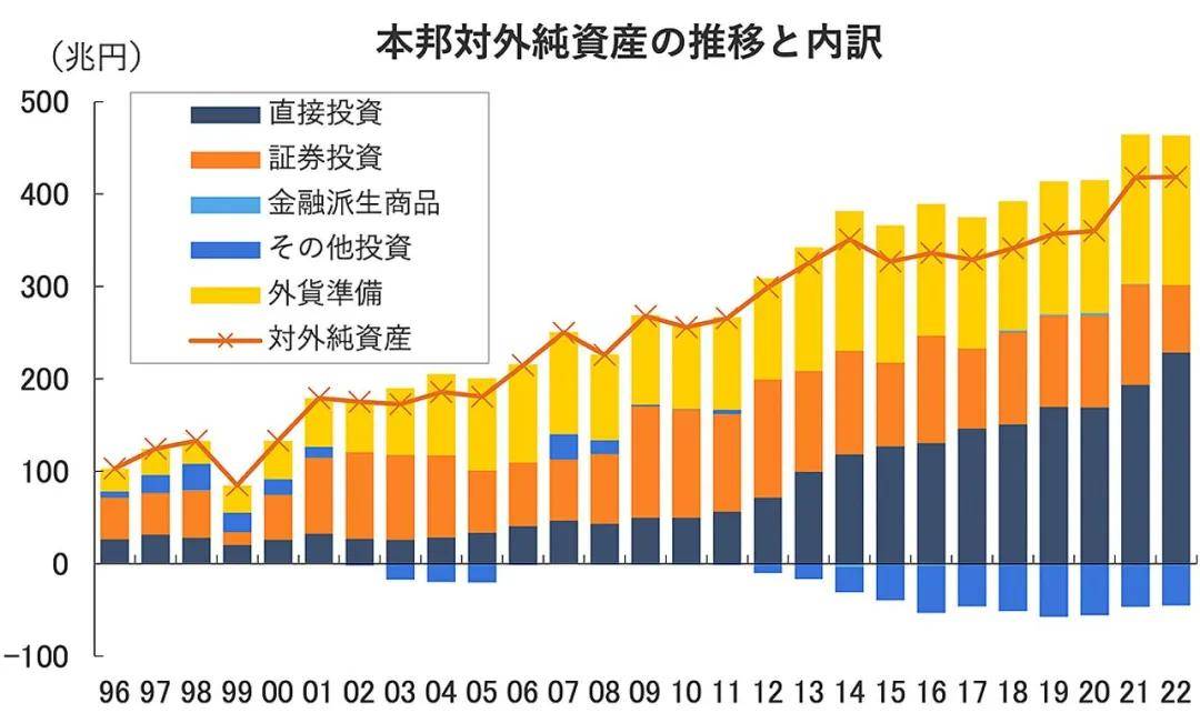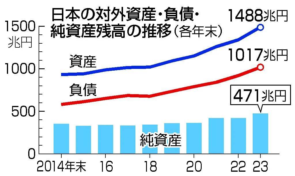 这里需要解释一下,日本政府、国内企业及个人在海外持有的“对外资产”总额,减去来自海外投资者和外企的“对外负债”总额,得到的差额即日本在海外拥有的净资产。